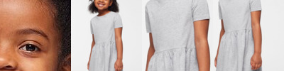 - Coverstitched sleeves and gathered skirt hem