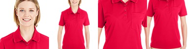 4.1 oz/yd² / 139 gsm, 100% polyester piqué with moisure-wicking, anti-microbial and UV protection performance; Matching flat-knit collar; Heat-sealed label; Four-button placket; Narrow placket for a feminine look; Chest pocket; Side slits;