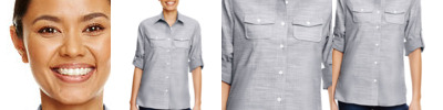 4.0 oz. 80/20 cotton/poly; 2 chest pockets, button flaps; Western half back yoke; Pearlized buttons; modern fit with roll up sleeve placket; Ladies tapered fit;