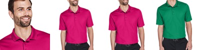 5 oz./yd2 / 172 gsm, 100% polyester face plaited to 60% polyester, 40% cotton back (total overall garment 61% polyester, 39% cotton); Proprietary dual-sided mesh pique knit constructed of fine denier wicking polyester on the outside and soft-as-cotton wicking blend on the inside; Moisture-wicking performance with UV 15-39 protection; Matching flat-knit collar; Luxury, comfort and performance in one; Three-button placket; Dyed-to-match buttons;