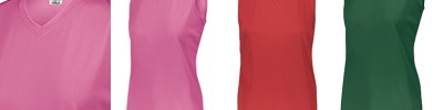100% polyester wicking knit with True Hue Technology® that helps prevent dye migration; Moisture-wicking; Tear away label; Ladies’ fit; V-neck collar;