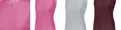 100% polyester wicking knit with True Hue Technology® that helps prevent dye migration; Moisture-wicking; V-neck collar; Tear away label;