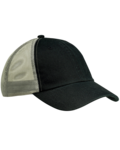 Fabric 100% cotton twill front panels and bill (Solids), 100% polyester mesh back panels; 65/35 polyester/cotton twill front panels and bill (Heather Grey)