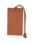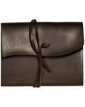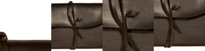 - Holds ID/business card behind clear PVC viewing window on back panel hidden by leather flap