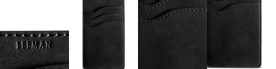 - Holds ID/business card behind acetate viewing window on back panel hidden by leather flap