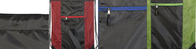 Two mesh side pockets with elastic edging (7"w x 7.5"h each)