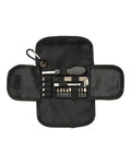 20-piece tool kit with components packed in case with hook and loop style closure and carabiner at corner