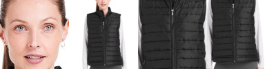 Shell: 100% recycled nylon; Inner Fill: 79% recycled nylon, 21% elastane; Water-resistant finish; 1.75" horizontal quilt lines; Reverse coil zipper with 2-way puller; Sewn in label at back neck; Stretch binding finish around armholes and at bottom opening; Top shoulder panels with vertical quilt lines; Silicone logo patch at upper back under neck seam; Side pockets with brushed knit bags; Sewn-in care and content label at lower left side seam; Relaxed fit; Fabric and garments are manufactured in a facility 100% powered by solar and wind energy. Fabric and garments are manufactured in a GreenCo certified facility. 450g of CO2 are saved with the production of each garment ;