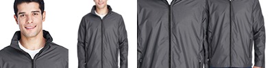 2.8 oz., abrasion-resistant 100% nylon taslan shell with polyurethane coating for enhanced wind- and water-resistance; 2.95 oz., 100% polyester dyed-to-match tricot big hole mesh lining in body; 1.7 oz., 100% polyester taffeta lining in sleeves; roll-away three-piece hood with 1¼" rain bill; Black 3/8" taping adds contrast to back and sleeves; EZEM zipper in back lining for easy decoration access; center front/lower pockets with molded plastic zipper with garage;