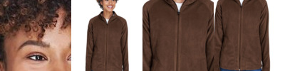 6 oz./yd² (US), 10 oz./L yd (CA), 100% polyester microfleece Anti-pill finish Center front reverse coil zipper with semi-autolock rubber pull tab Triple-needle coverstitch at raglan sleeve and front pockets Inseam front side pockets Self-fabric gusset at cuffs Double-needle stitch at bottom hem