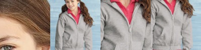 - Two-ply hood with rib trim, contrast color liner and drawcord